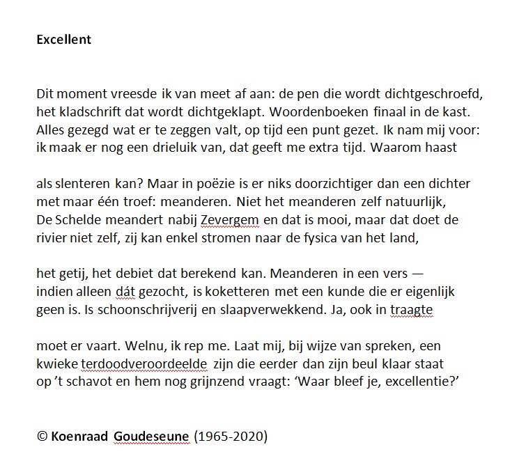 Een standbeeld in zijn geboortedorp zal Koenraad Goudeseune wel niet krijgen maar de fans van zijn werk hopen met mij dat de publicatie van zijn ‘Nagelaten gedichten’ een aanzet kan zijn om nog meer werk van deze eigenzinnige en al te vroeg overleden poète maudit beschikbaar te maken voor al wie er onbevangen voor openstaat.